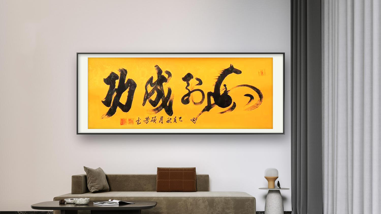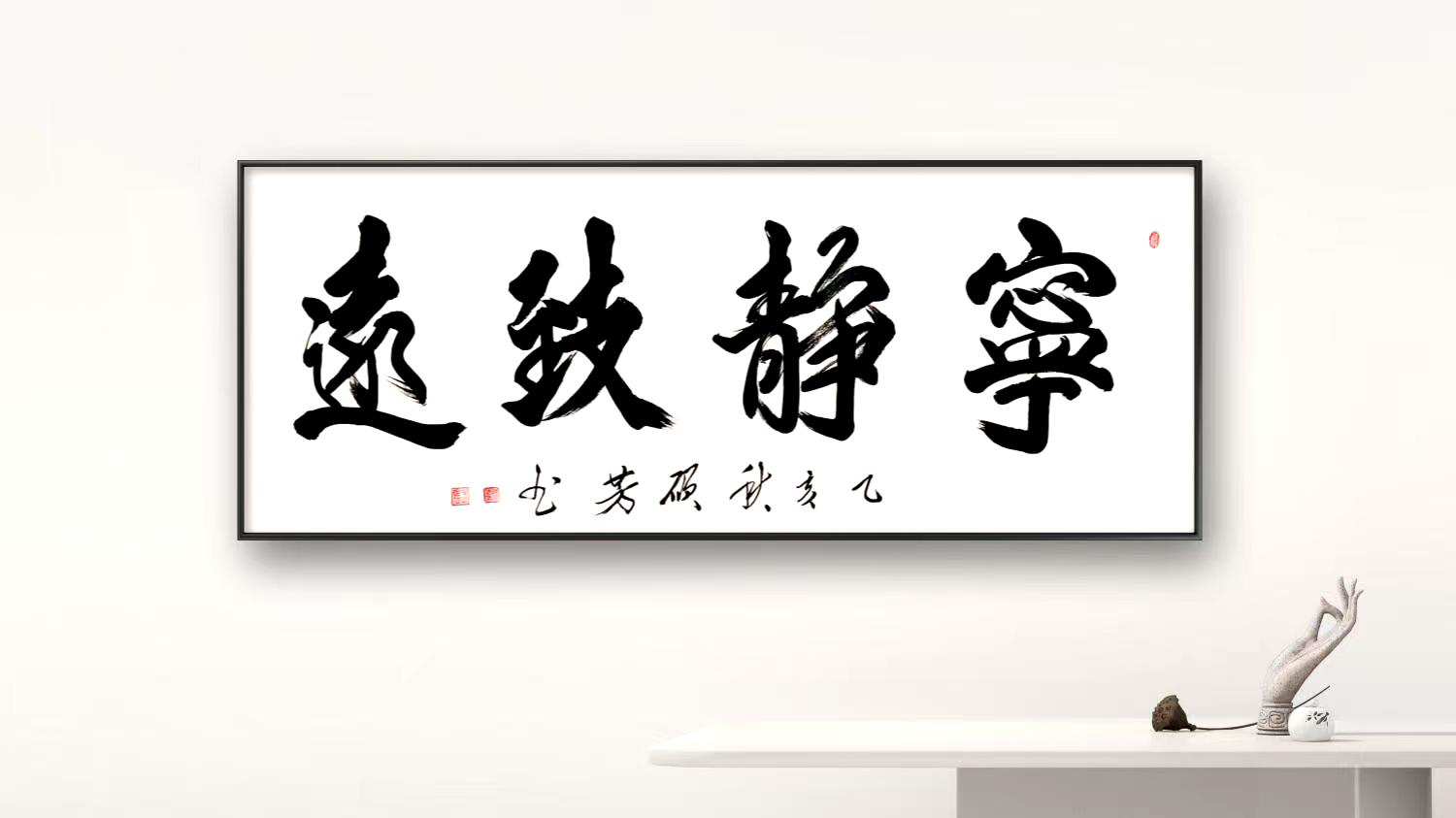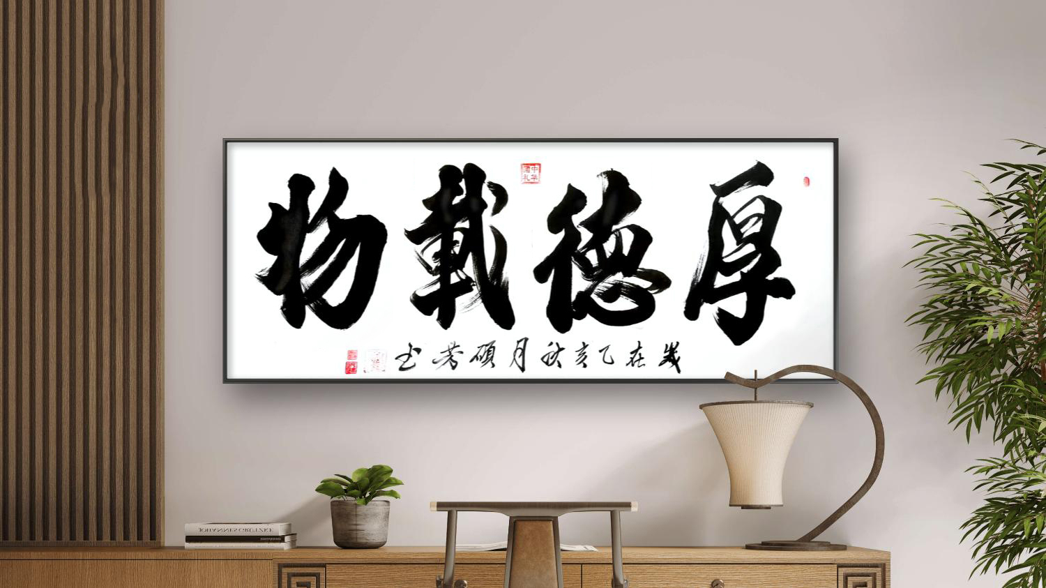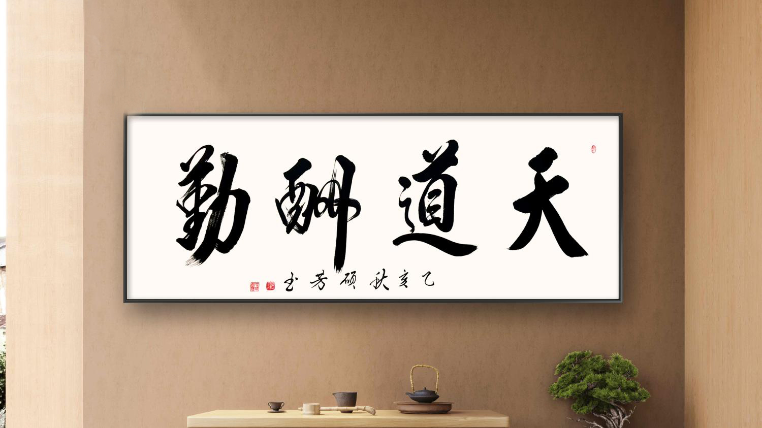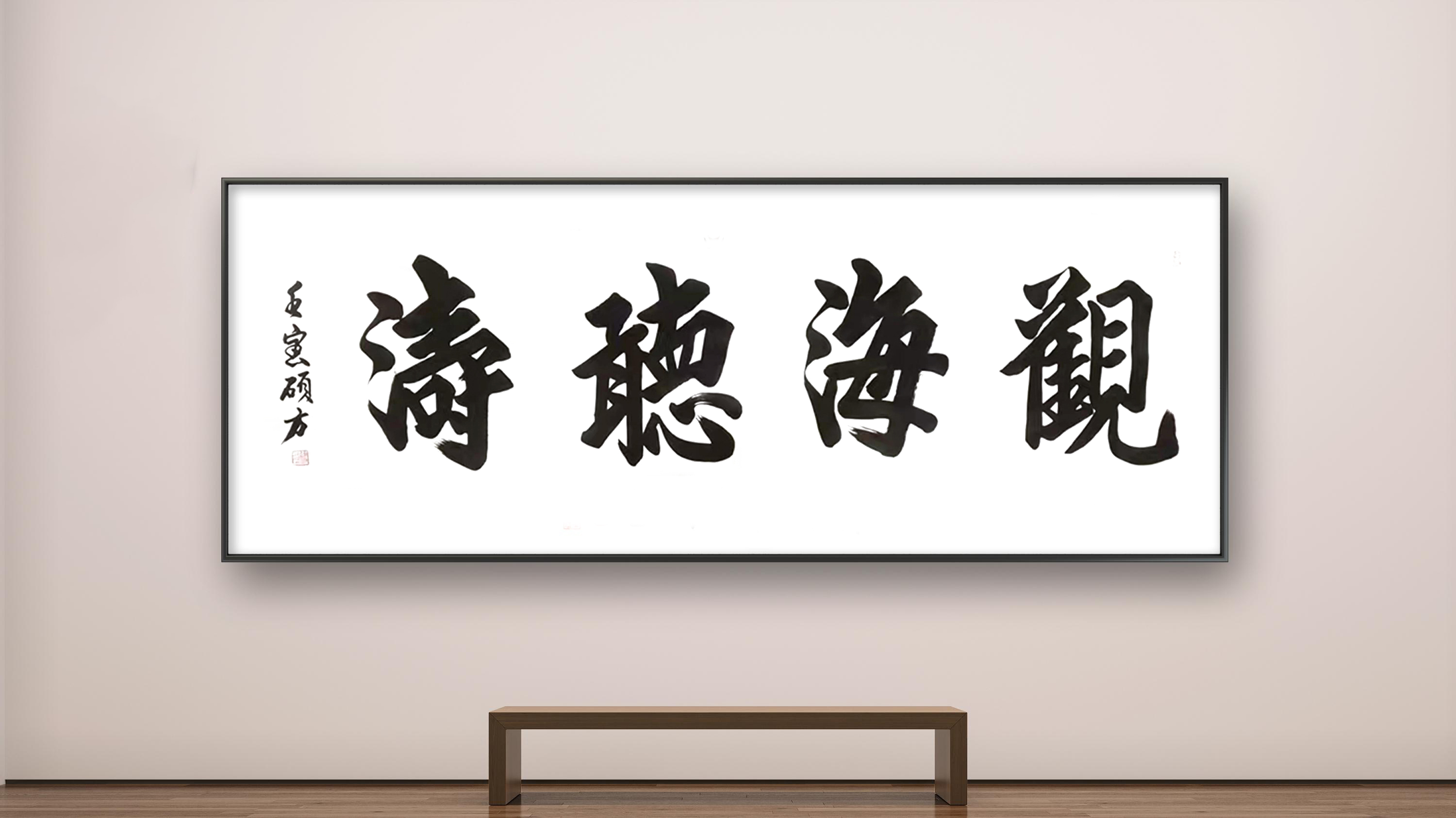 无论是《天道酬勤》的昂扬朝气、《厚德载物》的包容厚重,还是《观海听涛》的开阔意境、《宁静致远》的淡泊心境,他的榜书作品皆能以字传情,将文字内涵与笔墨气韵完美融合,做到“形神兼备,意韵相生”。这种独特的艺术风格,既源于对传统的深度敬畏,也来自对自我气质的精准表达——他不随时风、不逐流俗,深挖传统原生态书写技术,崇尚自然率意的创作状态,在追求“大巧大拙、大朴大美”的艺术境界中,开辟出属于自己的笔墨天地。
